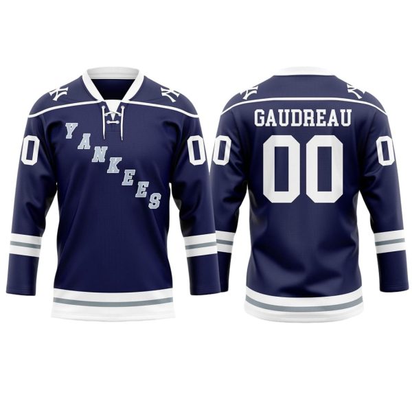 Designed in Yankees’ iconic navy and white, this jersey showcases bold diagonal “YANKEES” text, nodding to the team’s classic uniforms. A lace-up collar and white sleeve stripes add a hockey feel, while custom name and number options make it uniquely yours.
